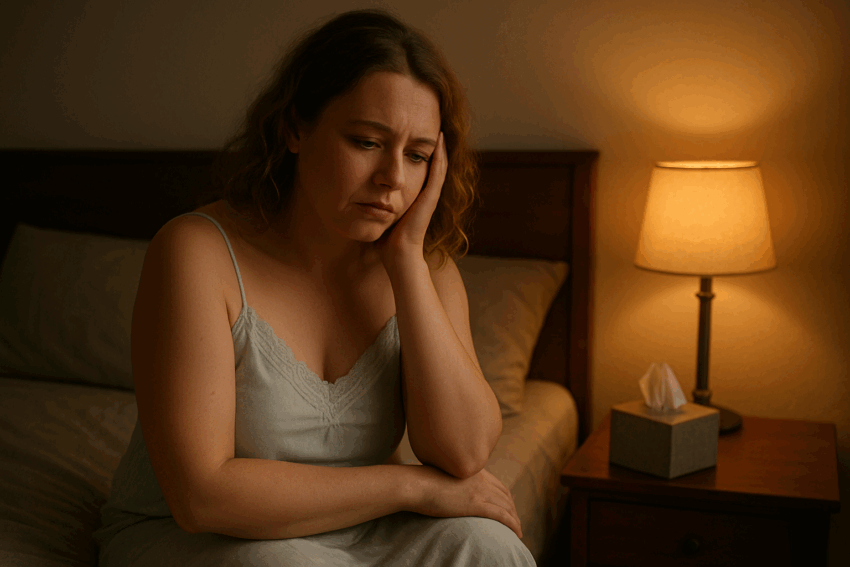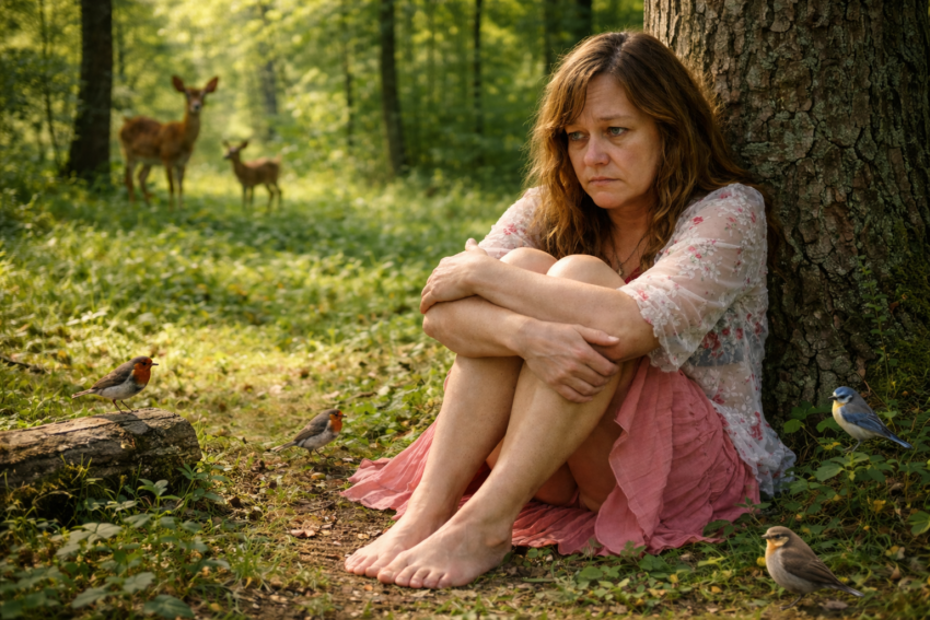 Depressieve vrouw die uitzichtloos voor zich uit kijkt, zittend tegen een boom in het bos.